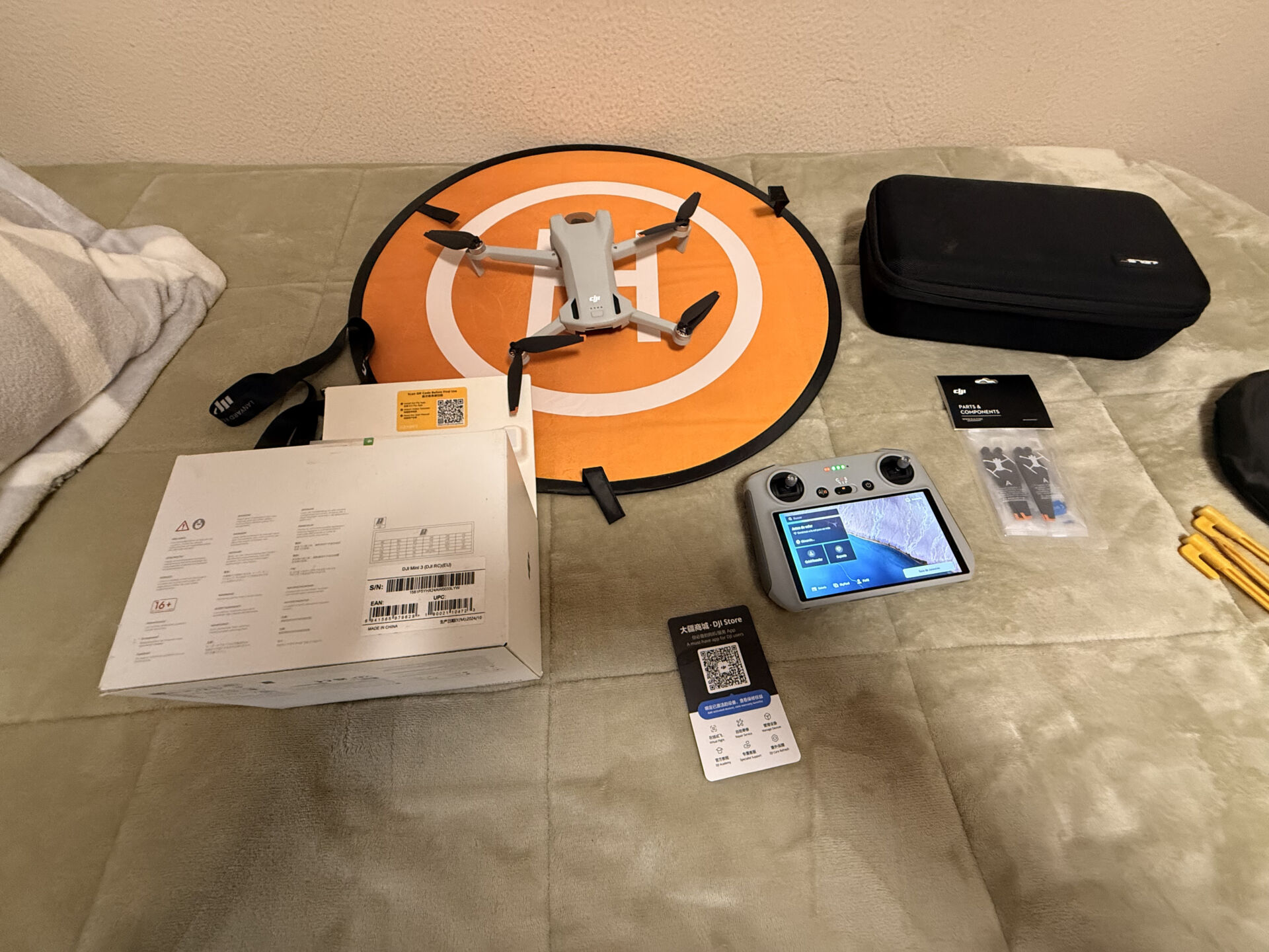 Se vende con su caja original, dos baterías, dos repuestos de hélices sin estrenar, base de aterrizaje, bolsa de transportes, dos memorias cargador de baterías, todo lo que se ve en la foto.